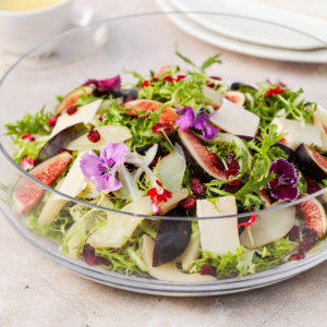 Ensalada de Mix de Lechugas, Peras confitadas, Higos, Nueces, Cranberries, Queso de Cabra y Vinagreta Balsámica