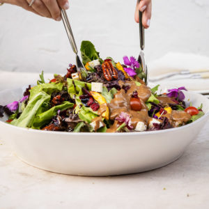 Ensalada de Mix de Lechugas, Arúgula, Loche Confitado, Pecanas Acarameladas, Arándanos, Queso Feta y Reducción Balsámica