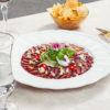 Láminas muy finas de conchas de abanico, aliñadas con una salsa hecha a base de dill, toronjil, perejíl, limón y vinagre de vino blanco que realzan su sabor.