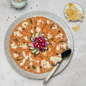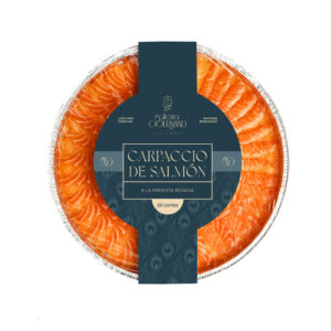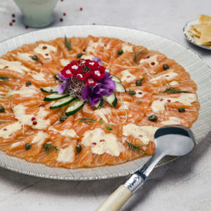 Láminas muy finas de salmón crudo, aliñadas al momento de servir con la mezcla de aceite de oliva , sal y pimienta rosada.