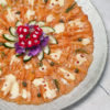 Láminas muy finas de salmón crudo, aliñadas con mezcla de aceite de oliva , sal, alcaparras y decoradas con ciboullete.
