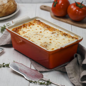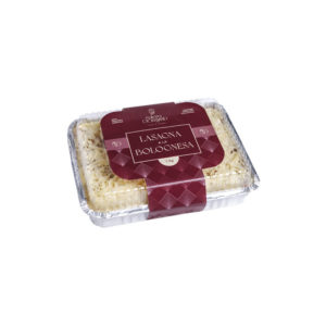 Pasta en láminas intercaladas con bolognesa de carne preparada a fuego lento para concentrar todos los sabores, salsa bechamel y abundante mozzarella y parmesano.