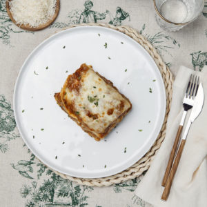Pasta en láminas intercaladas con una boloñesa de carne, berenjena y zucchini, salsa bechamel y abundante mozzarella y parmesano.