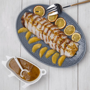 Solomillo de cerdo, corte jugoso y versatil, que se acompaña de una salsa muy ligera de naranja a la mostaza en grano.