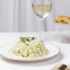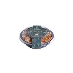 Salmón crudo picado fino al que opcionalmente se le agrega una salsa acevichada.